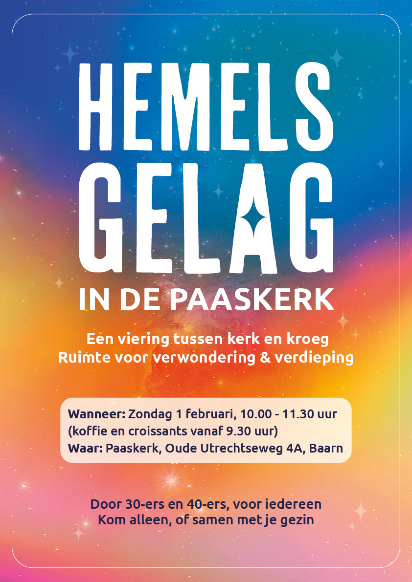 Kom je nooit in de kerk? Of ben je er al lang niet geweest? Dat geldt voor velen. Terwijl we zingeving op z'n tijd wel kunnen waarderen. De Paaskerk in Baarn is een plek waar we met een groep dertigers en veertigers de ruimte voelen en vrijheid krijgen het op zondagochtend 1 februari weer eens anders te doen, voor een kerkvorm die bij onze leeftijd past. Onderdelen duren telkens 10-15 minuten, kinderen doen mee, en iedereen kan vrij in- en uitlopen.
